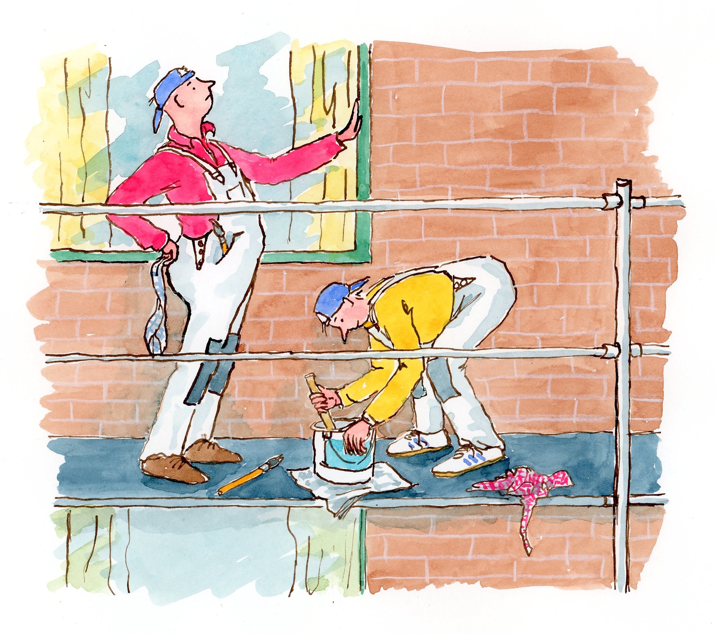 Bij de eerste happen van mijn favoriete geitenkaassalade leef ik wat op. Maar het drukke plein, waar mijn man en dochter met hun rug naar toe zitten en waar ik als enige uitzicht op heb, leidt me enorm af. Vooral de twee schilders die bezig zijn met het huis aan de overkant. Als Buurman en Buurman staan ze op de steiger te rommelen met een pot witte grondverf voor de kozijnen. En dan gaat het inderdaad, volgens het vaste script, mis. De hele pot kleddert in zijn geheel tegen de bruine bakstenen muur en druipt hopeloos naar beneden.
