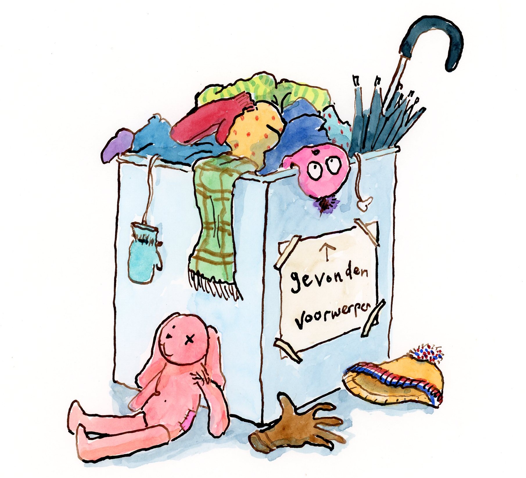 Voor ik de Albert Heijn uitloop, valt mijn oog op een bak met gevonden voorwerpen. Hij puilt uit van handschoenen, wanten en mutsen. Inmiddels is de dooi ingetreden. De dikke laag sneeuw smelt langzaam weg. Terug wandelend naar huis zie ik wat er allemaal onder vandaan komt. Vuurpijlen, hondendrollen, verloren fietssleuteltjes... En ook hier veel verweesde wanten en handschoenen. Op elke hoek van de straat ligt er wel een op een paaltje of heg, te wachten op zijn eigenaar.
